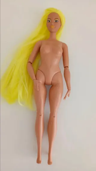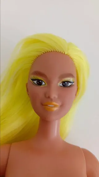 Boneca Barbie com cabelo longo e vibrante na cor amarelo neon. Possui articulações nos joelhos e cotovelos para maior mobilidade. - Cabelo sintético amarelo neon. - Articulações nos cotovelos. - Articulações nos joelhos.