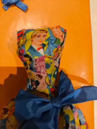 Conjunto de vestido para Barbie com estampa divertida e detalhes em azul. - Vestido com estampa de Barbie e Ken. - Laço azul grande na frente. - Lenço azul. - Sapatos azuis.