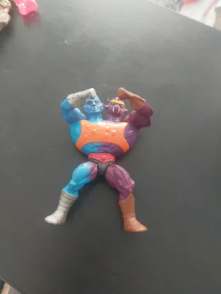 Boneco antigo da Mattel, fabricado em 1984. Apresenta um design com duas cabeças e cores vibrantes. - Fabricado pela Mattel. - Ano de fabricação: 1984. - Design de duas cabeças. - Cores: azul, roxo e laranja.