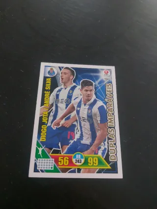 Cromo da coleção Adrenalyn XL 2016/2017. - Apresenta os jogadores Diogo Jota e André Silva. - Duplas Imparáveis. - Cartão com os valores 56, 243 e 99.