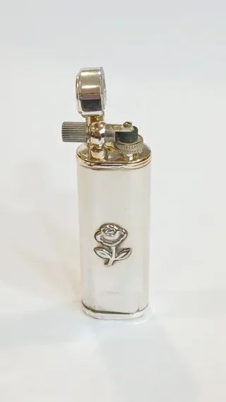 Isqueiro a gás em prata com um delicado detalhe de rosa. - Material: Prata constratada - Design: Rosa em relevo -recarregável -estado novo