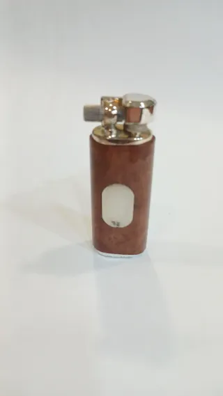 Isqueiro a gás da marca André Denis. - Corpo em madeira. - Detalhe em metal prateado. - Inserção de placa em prata constratada.