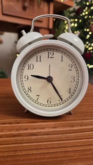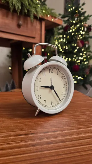 Despertador analógico com um design clássico e elegante. - Cor branca - Detalhes em metal - Ponteiros pretos