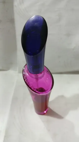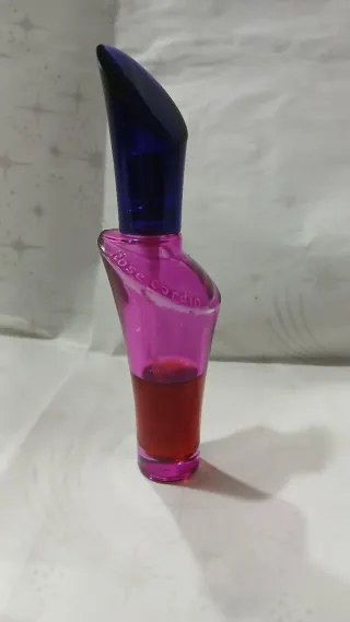 Frasco vazio de perfume Rose Cardin de Pierre Cardin. O frasco tem um design elegante e a cor rosa vibrante. - Frasco de perfume com perfume original. - Marca: Rose Cardin by Pierre Cardin. - Cor: Rosa e azul. - Original de 1990 -Óptimo para colecionador