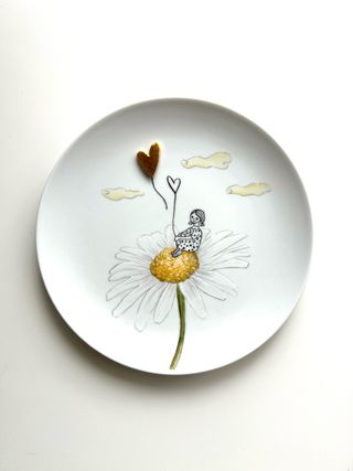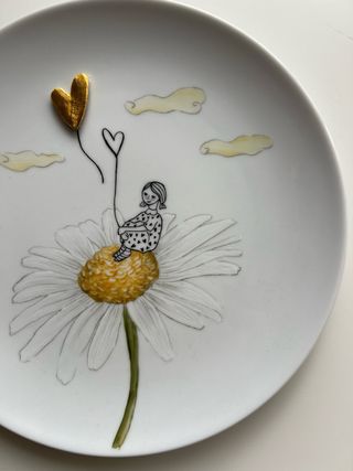 Prato decorativo de 16 cm, pintado à mão, peça autoral e única. Ilustração delicada e poética de menina sobre margarida, com balão em forma de coração e detalhes em ouro, finalizada com queima em forno cerâmico para fixação da arte. É um objeto de arte para: • decorar paredes • prateleiras • quartos infantis • ambientes delicados • oferecer como presente especial e simbólico Não é um prato comum — é uma peça artística com narrativa e sensibilidade. Cada traço é feito à mão, tornando impossível existir outro igual.