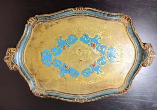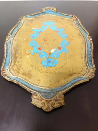 Travessa em Madeira muito antiga em tons dourados e azuis em bom estado A parte da madeira está sem danos, apenas pequenos desgastes na pintura Travessa em madeira trabalhada à mão Travessa trabalhada em madeira leve Envio seguro (caixa dupla) Medidas: 60 cm x 38 cm Peso: 670 gramas