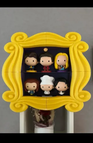 Suporte para conjunto de figuras do Mac Donalds da série Friends. Ideal para colecionadores. - Design inspirado na moldura icónica da série. - Amarelo vibrante. - figurinas não incluídas