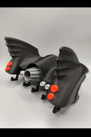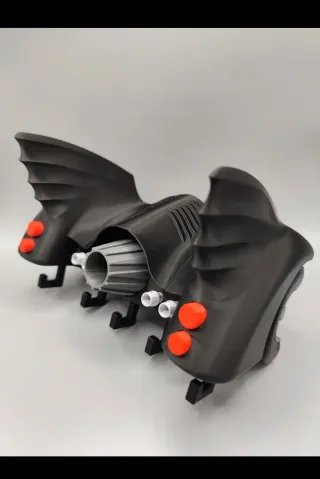 Peça decorativa inspirada na traseira do Batmobile, com função de porta-chaves. - Design icónico em preto. - Detalhes em vermelho e cinza. - Suportes para fixação.