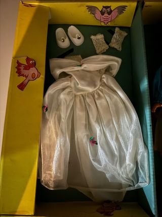 Boneca Nancy original dos anos 70, completa com a sua caixa. - Inclui dois vestidos. - A caixa apresenta elementos decorativos de pássaros e uma coruja.