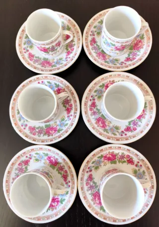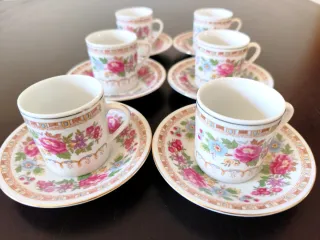 Lote de 6 chávenas de café em porcelana chinesa com um delicado padrão floral em muito bom estado (novo) Pires e chávenas sem sinais de uso, sem defeitos ou danos (novo, a estrear) Chávenas e pires em porcelana chinesa antiga (vintage) Preço para o conjunto das 6 chávenas e pires Envio seguro (caixa dupla) Peso (total): 1200 gramas