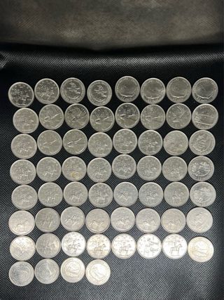 Conjunto de 60 moedas de 25 centavos, ideais para colecionadores ou para quem procura moedas comemorativas. - Moedas de 25 cents - Quantidade: 50 unidades. - Diversos designs e anos.