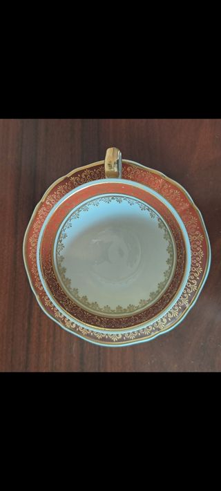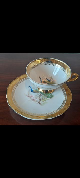 Chávena de Luxo - marca Vista Alegre. Tanto a chávena como o prato apresentan um desenho extremamente delicado com um magnífico estampado de pavão real e detalhes dorados. Muito antiga.