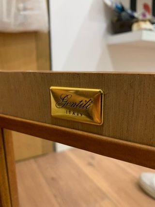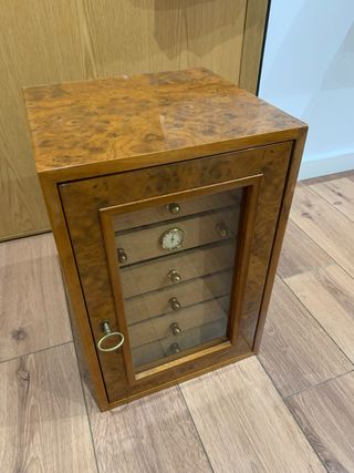 Humidificador de charutos italiano da marca Gentili. Peça com acabamento em madeira e detalhes em metal. Posso entregar em mão na zona de Lisboa - Design clássico e elegante. - Porta de vidro. - Puxadores dourados.