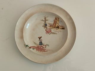 Prato sopeiro produzido na Fábrica de Faianças das Caldas da Rainha entre 1888 e 1892. Exemplar de fabrico sobre a administração de Rafael Bordalo Pinheiro. Decoração baseada em elementos evocatórios à cidade de Lisboa, nomeadamente a Torre de Belém e a típica varina de Lisboa, enquadrados por fauna marinha como o Lavagante, Caranguejo e Moluscos. Mede 25,5 cm de diâmetro e encontra-se em bom estado de conservação, com algumas manchas. Exemplar em faiança fina ou pó de pedra de fábrica com produção curta e bastante escassa.