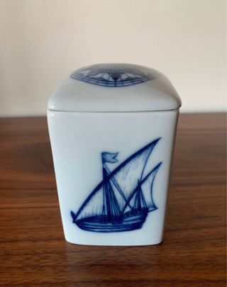 Caixa de tabaco da Vista Alegre, parte da coleção Bartolomeu Dias. Peça em porcelana branca com decoração azul. Caixa de tabaco Vista Alegre, coleção “Bartolomeu Dias”, nova 10,5 x 7 x 7 cm