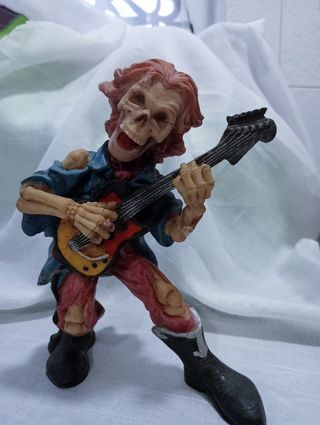 Figura Esqueleto Guitarrista da marca Rock To Death em resina. *artigo que tenho desde 2010 *artigo raro *esteve sempre exposto na prateleira. *o artigo em si sofreu um acidente (sendo que na parte da perna direita partiu e voltei a colar), nas últimas fotos poderá ver a zona que quebrou. Tirando isso o artigo está bom,para colecionismo. *as medidas estão na foto.