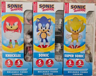 Conjunto de três figuras para montar da linha clássica Sonic the Hedgehog. As figuras são novas e estão em suas embalagens originais. - Inclui Knuckles, Sonic e Super Sonic. - São figuras para montar. - Cada figura vem com uma gema ou anel escondidos.