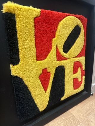 Icónico tapiz múltiple “LOVE” de Robert Indiana Colección Galerie Ferrero Detalles: • Artista: Robert Indiana • Colección: Galerie Ferrero Collection • Tema: LOVE • Técnica: Hand tufted (elaboración artesanal) • Material: 100 % lana • Dimensiones: 38,1 x 38,1 cm (15” x 15”) • Firma del artista: reproducida • Montado en: marco de madera negra • Tipo: obra decorativa y de colección Condición: Excelente estado