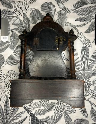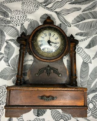 Este relógio de mesa vintage adiciona um toque clássico a qualquer espaço. Possui um design em madeira com detalhes ornamentados. - Acabamento em madeira escura. - Detalhes em metal. - Inclui uma pequena gaveta.