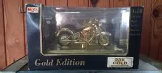 Miniatura de colecionador da Harley Davidson, edição especial Gold Edition da Maisto. - Escala 1:18. - Acabamento em 23K Gold Plated. - Construção em Die-Cast Metal com peças em plástico.