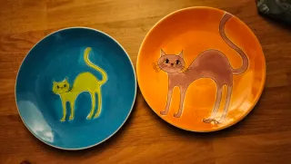 Conjunto de dois pratos decorativos com ilustrações de gatos. - Um prato com fundo azul e gato amarelo. - Um prato com fundo laranja e gato castanho. 8€ cada prato, posso vender em separado Marca: A Loja do Gato Preto