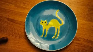 Prato decorativo com gato azul e laranja