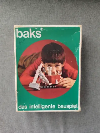 Conjunto de construção Baks. - Modelo A10. - Inclui peças para construir casas e um moinho de vento. - Caixa com ilustrações de modelos.