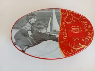 Lata decorativa Nestlé Caja Roja. - Diseño ovalado. - Motivos florales dorados. - Imagen de dos niños jugando con un velero.