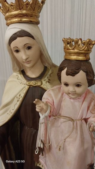 Linda imagem de Nossa Senhora do Carmo com o Menino Jesus. Peça delicada e bem conservada. - Imagem em resina, rica em detalhes. - Nossa Senhora e o Menino Jesus usam coroas douradas. - Acabamento impecável.