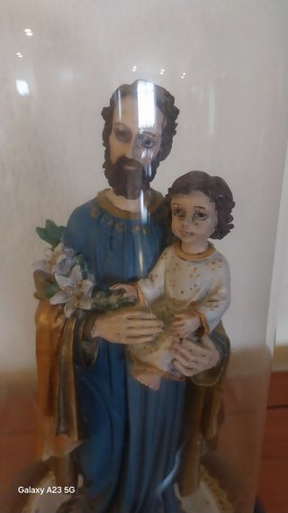 Linda estátua de São José com o Menino Jesus, em resina. Está em perfeito estado e protegida por uma cúpula de vidro. - Material: Resina - Inclui cúpula de vidro e base de madeira - Detalhes delicados e bem conservada