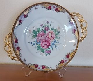 Lindo prato decorativo com alças de metal dourado. Ideal para decoração ou uso em ocasiões especiais. Pintado à mão Diâmetro =28cm LIMOGES - Prato de porcelana com pintura floral. - Detalhes em dourado na borda. - Alças elegantes e ornamentadas. - Peça única e charmosa.