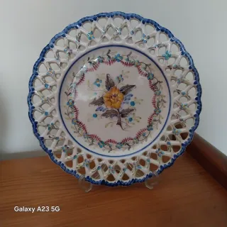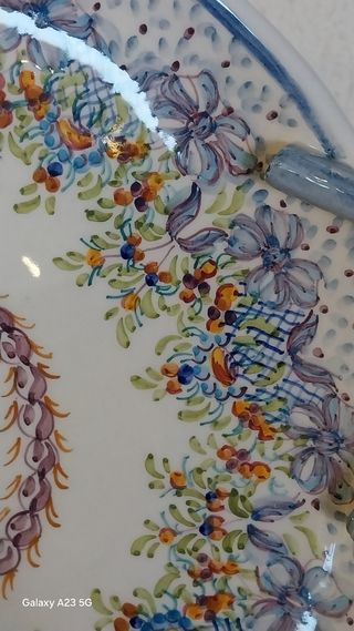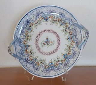 Prato decorativo de cerâmica, pintado à mão, com um design floral encantador. Possui duas alças laterais. É uma peça única e charmosa, ideal para decoração ou uso em ocasiões especiais. - Cerâmica de alta qualidade - Pintura manual com detalhes florais - Duas alças práticas - Design elegante e sofisticado