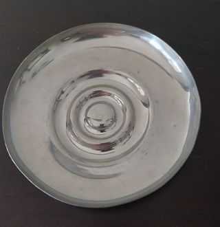 Elegante plato decorativo de estaño. Ideal para decorar cualquier espacio. - Diámetro aproximado: 15 cm - Material: Estaño - Diseño circular con relieves concéntricos - Acabado brillante y pulido