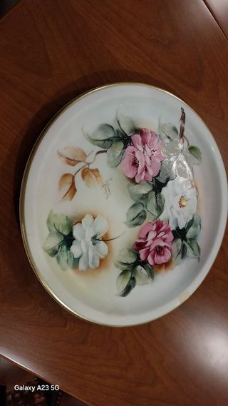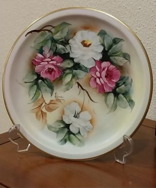 Lindo prato decorativo com pintura artesanal de flores. Ideal para decoração de interiores. - Pintura delicada e detalhada. - Bordas douradas. - Design floral romântico. - Peça única e charmosa.