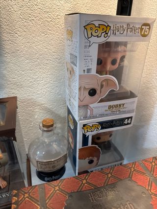 Conjunto de colecionáveis temáticos de Harry Potter. - 3 Figuras de personagens. (Pop) dobby, ron, nagini - Suportes para fotos ou cartões. (Hermione, harry (um pouco danificado) e snitch - varinha Hermione - caixa de quidditch c/poster - 2 lanternas/candeeiro ( hogwarts + poção)