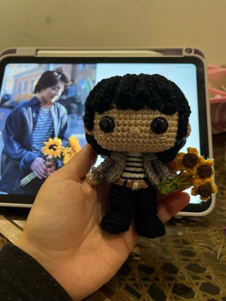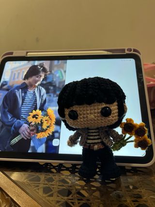 Boneco amigurumi artesanal, feito 100% à mão em crochê, com acabamento delicado e atenção a cada detalhe. ✨ Detalhes do produto: • Técnica: Amigurumi (crochê) • Material: fio 100% acrílico / algodão (ajuste se necessário) • Olhos com trava de segurança • Acompanha buquê de girassóis em crochê • Peça única. 📏 Tamanho aproximado: 14 cm 🎁 Ideal para presentear fãs de K-pop, colecionadores ou decoração afetiva. ⚠️ Não recomendado para crianças menores de 3 anos (contém peças pequenas).