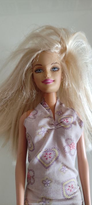 Boneca de pelúcia com cabelo loiro e olhos azuis. - Material macio e agradável ao toque. - Detalhes bordados no rosto, incluindo bochechas rosadas. - Pernas e braços flexíveis.