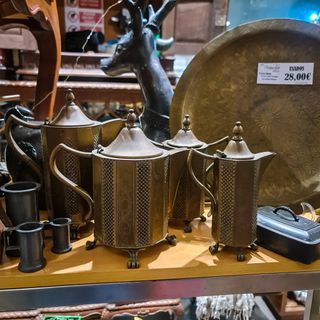 Peças de inspiração clássica, muito usadas em serviços de café/chá no início do séc. XX, ideais para decoração vintage, cenografia ou colecionismo. ✨ Características Conjunto com 4 peças (diferentes tamanhos) Corpo octogonal com trabalho em relevo Pés elevados e asas laterais curvas Tampas com pega decorativa Material: metal (latão ou liga semelhante) Estilo clássico / vintage europeu 📌 Estado Bom estado geral para a idade Patina natural do tempo visível Sem quebras ou faltas estruturais Vendido como conjunto