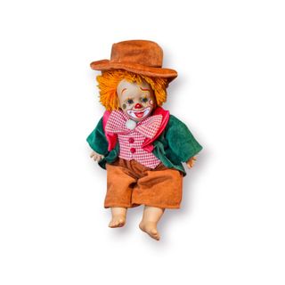 A combinação de cores vivas, materiais têxteis e expressão característica confere-lhe uma forte presença decorativa, ideal para montras, prateleiras ou ambientes retro. Características principais: Tipo: Boneco palhaço Estilo: Vintage / clássico Material: Corpo em material sintético + roupa em tecido Acessórios: Chapéu incluído Utilização: Decorativa / colecionismo Medidas e peso (aprox.): Altura: 28 cm Peso: ~350 g Estado de conservação: Bom estado geral para a idade. Roupa original preservada, com sinais normais do tempo. Sem quebras estruturais visíveis.