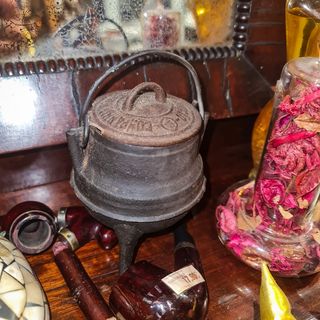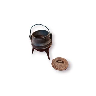 Ideal para decoração de cozinhas tradicionais, lojas temáticas, montras, ou para colecionadores de objetos industriais portugueses. Características principais: Mini caldeirão em ferro fundido Produção portuguesa – Made in Portugal Tampa original com inscrição da fundição Três pés e pega metálica superior Peça robusta, de carácter industrial Excelente valor decorativo e histórico Nota sobre o estado: Apresenta pequeno dano na tampa, visível nas imagens, sem comprometer a integridade nem o impacto visual da peça.
