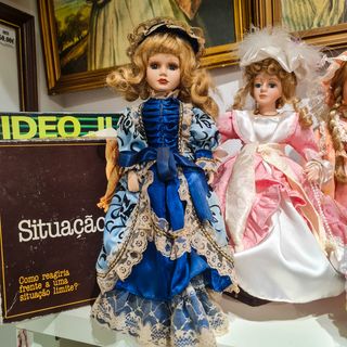 Com expressão facial detalhada, olhos azuis marcantes e cabelo loiro encaracolado, esta boneca destaca-se pela qualidade dos materiais e pelo cuidado nos acabamentos do vestuário. Apresenta-se em excelente estado geral, sem sinais relevantes de desgaste. 📏 Altura aproximada: 41 cm ⭐ Características principais Cabeça, mãos e pernas em porcelana Vestido clássico em tons de azul com rendas e laços Cabelo loiro encaracolado, bem conservado Expressão facial detalhada e delicada Estilo decorativo vintage / clássico Peça de destaque para coleção ou decoração 📝 Estado de conservação: Excelente estado geral.
