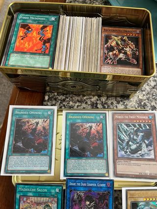 Conjunto de cartas de Yu-Gi-Oh! com várias cartas raras e procuradas. - Branded Opening (x2) - Mobius the Frost Monarch - Madolche Salon - Dharc the Dark Charmer, Gloomy - Blue-Eyes White Dragon - Raigeki - Dark Magician - Pequena Maga Negra
