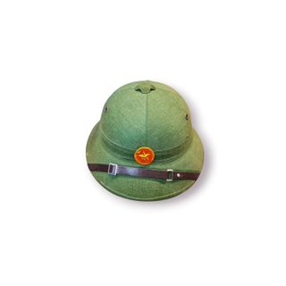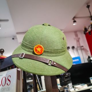 Ideal para coleção, exposição temática ou cenografia histórica. Características principais: Capacete militar vietnamita (período pós-2ª Guerra Mundial) Utilização em clima tropical (fibra prensada) Estrela vermelha frontal (iconografia vietnamita) Interior original com suspensão em tecido Ventilações laterais metálicas Peça autêntica de uso histórico Estado de conservação: Bom estado geral, com marcas de uso e envelhecimento compatíveis com a idade e função. Interior íntegro, correias presentes.