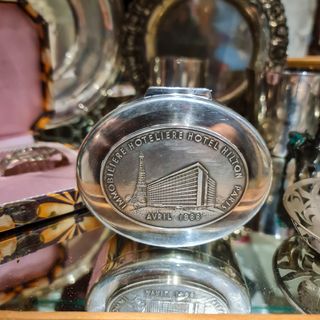 Originalmente destinada a oferta institucional ou comemorativa, trata-se hoje de um objeto de coleção raro, reunindo valor histórico, material nobre e forte identidade internacional. Características principais: Prata de Lei 925 (contrastada) Marca de fabricante: iniciais “BR” (símbolo adicional ilegível) Peça comemorativa do Hotel Hilton Paris Data gravada: Avril 1966 Interior forrado a veludo vermelho Objeto institucional / colecionável de época Medidas e peso: Altura: 4 cm Largura: 9,5 cm Profundidade: 3,5 cm Peso: 240 g 🔎 Estado de conservação: Muito bom estado geral, com sinais leves e naturais do tempo.