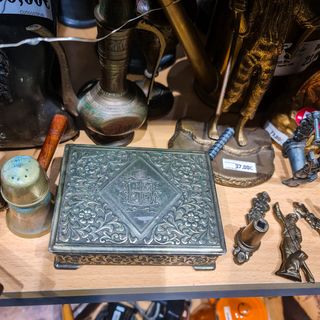 Uma peça com história, presença e carácter, perfeita para quem aprecia objetos antigos com identidade e honestidade material. Características principais: Caixa decorativa antiga de produção japonesa Marcação original “JAPAN” Metal: bronze ou liga rica em cobre Decoração floral em relevo e motivo central ornamental Tampa articulada Peça sólida, pesada e de excelente presença Nota sobre o estado: Apresenta sinais naturais do tempo e oxidação interior compatível com a idade e o material. Exterior com desgaste normal, mantendo ótima leitura decorativa. 📐 Medidas & Peso Altura: 3,5 cm Largura: 12 cm Profundidade: 9 cm