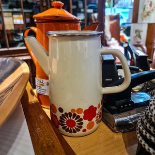 Características principais: Tipo: Chaleira esmaltada Material: Metal esmaltado Decoração: Motivos florais retro Bico: Vertedor com função de filtragem Interior: Esmaltado, com perfurações internas Asa: Lateral, esmaltada Época: c. 1960–1970 Medidas e peso: Altura: 18 cm Comprimento (bico à asa): 18,5 cm Diâmetro: 9,5 cm Peso: 558 g ⚠️ Nota sobre o estado: Peça usada, com sinais normais do tempo e do uso, nomeadamente marcas internas e pequenos pontos de desgaste no esmalte, compatíveis com a idade. Sem fissuras estruturais.