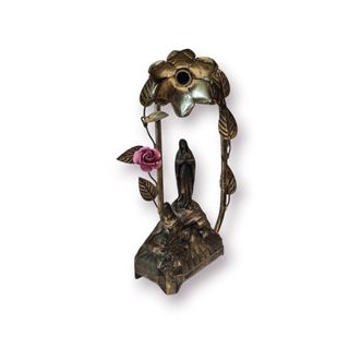 Inscrição original na base: “L’APPARITION DE LOURDES”. Características principais: Escultura religiosa francesa – Aparição de Lourdes Material: metal prateado / liga metálica (não prata) Estrutura decorativa com motivos florais e rosa esmaltada Inscrição original na base Pátina antiga natural, muito valorizada Forte valor simbólico, histórico e decorativo 📐 Dimensões: Altura: 26 cm | Largura: 11 cm ⚖️ Peso: 728 g 🔎 Estado de conservação: Bom estado geral, com sinais naturais do tempo compatíveis com a antiguidade da peça.
