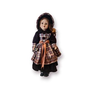 Uma peça que se destaca pelo tamanho, pela presença e pela autenticidade dos materiais — ideal para quem procura decoração vintage com alma ou uma boneca antiga verdadeira, longe das reproduções modernas. Ideal para: decoração vintage ou clássica quartos infantis temáticos colecionadores de bonecas antigas montras e cenografia Características principais: Tipo: Boneca antiga decorativa Materiais: Cabeça, mãos e pés: porcelana Corpo: pano (tecido) Estilo: Europeu vintage Vestuário: Vestido xadrez, capa em veludo e chapéu Época estimada: c. 1940–1960 Medidas e peso (aprox.): Altura: 41 cm Largura máxima: ~15 cm