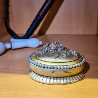 Características principais: Caixa decorativa com tampa amovível Material: porcelana ou gesso moldado Acabamento em pintura dourada metálica Tampa com motivo floral em relevo Friso perolado decorativo Base canelada de inspiração clássica Estilo vintage / romântico Medidas: Altura (com tampa): 4,5 cm Largura: 8 cm Profundidade: 6,5 cm Peso: 153 g Estado de conservação: Bom estado geral. Apresenta ligeiras marcas do tempo e desgaste pontual na pintura, normais para peças deste género e idade, sem fissuras estruturais visíveis.