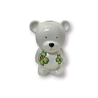 Cofre decorativo em cerâmica vidrada, em formato de ursinho, decorado com trevos verdes e joaninhas pintadas à mão. Peça encantadora, ideal para quarto infantil, decoração temática da sorte ou para quem gosta de objetos com ar delicado e tradicional. Abertura superior para moedas e base com tampão inferior para remoção do conteúdo. Características principais: • Material: Cerâmica vidrada • Altura: 23 cm • Largura: 13 cm • Peso: 716 g • Abertura superior para moedas • Tampa inferior removível Estado geral bom. Apresenta pequeno desgaste na pintura na zona frontal inferior (ver fotos) e marcas normais de uso na base.